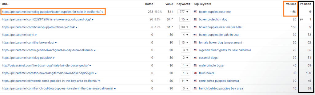 One of the top-performing keywords is “Boxer Puppies near me”, a mid-funnel search term that signals customers are deep into the buying process. Getting 300 visitors from a term like that is a huge win.