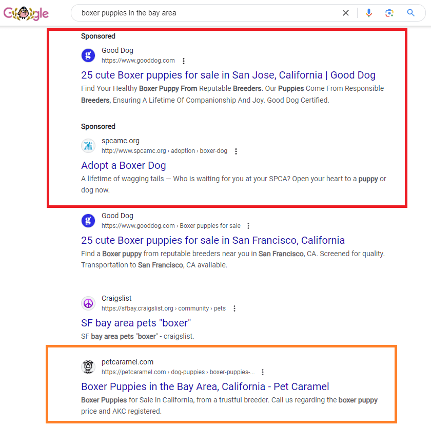 Another important keyword is “Boxer Puppies in the Bay Area,” currently ranking in position #3 on Google, right behind Good Dog and Craigslist.